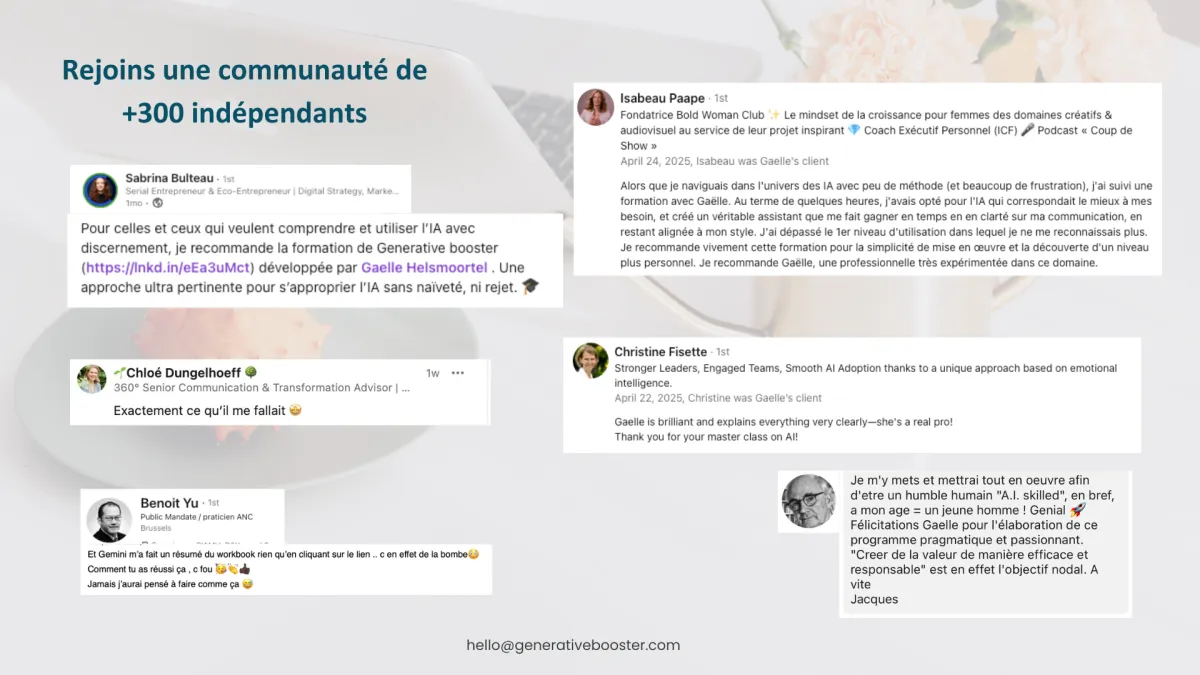 Créatrice de la Generative AI Methodology, j'ai déjà aidé plus de 300 consultants et dirigeants à intégrer l'IA, non pas comme un gadget, mais comme un véritable levier de croissance.